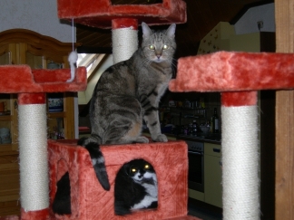 Moritz mochte Socke nicht besonders und die erste Zeit hat der Kleine ganz schön Prügel eingesteckt. Nun wird er von Moritz wohl gedudet und Moritz läst sich ab und zu herab, , um sich abschnuppern und die Öhrchen ablecken zu lassen